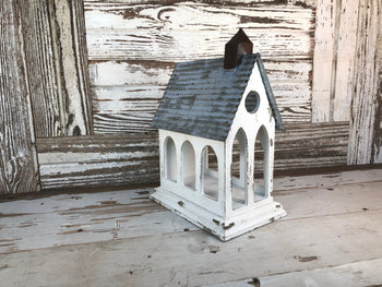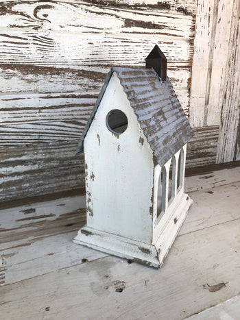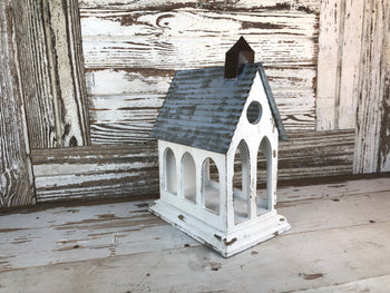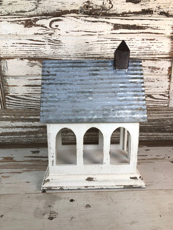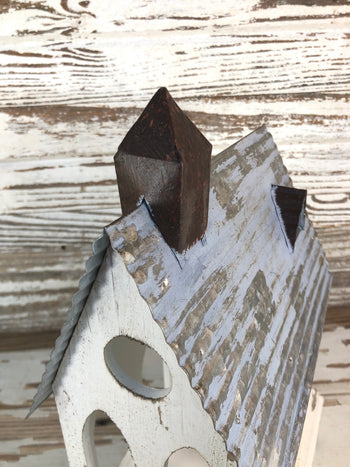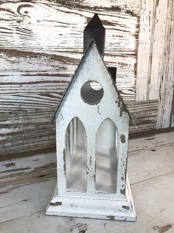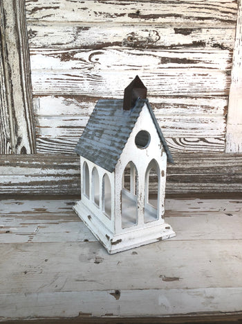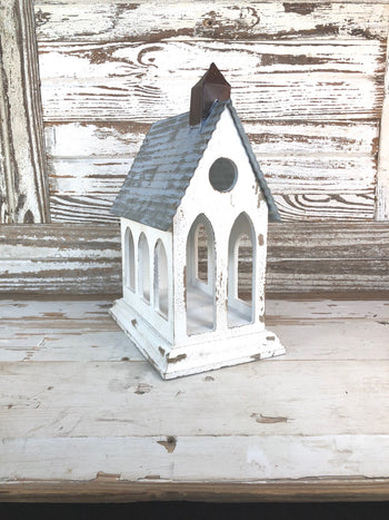 The Quiet Chapel brings a sweet touch to your farmhouse this season, with a soft, weathered whitewash and muted silver-gray tones. Designed to look like a simple countryside church, this pretty little building has a graceful elegance that offers a delightful decorative element to your cozy rooms. Constructed of wood and galvanized metal with tall, cut-out windows, this chapel brings texture and dimension to any setting with a refined styling. Display on a vintage steamer trunk or hall table this Summer or Fall or incorporate into a display on your mantel at Christmas time.