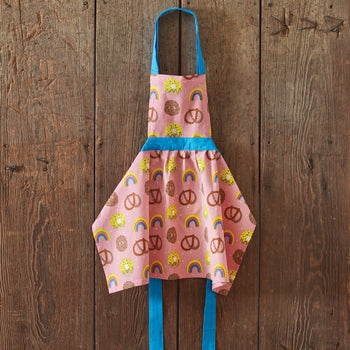 Sugar rush! Your little girl will love the tasty treats and rainbows on this bright, pink apron. It will allow your little ones to bake alongside yourself, while keeping them clean. Apron has a neck tie and a waist tie. Made of 100% cotton.