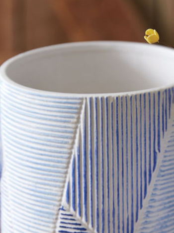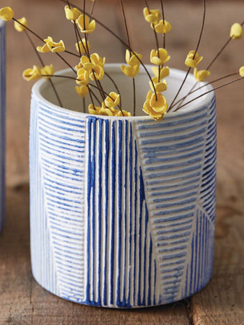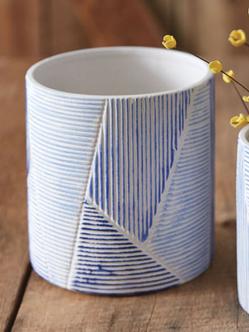 The bright pops of color will be sure to make a splash in a room with these clay pots. Featuring shades of blue, it will have you wishing you were at a tropical lagoon. Plant your own flowers inside. Also available in a matching vase!