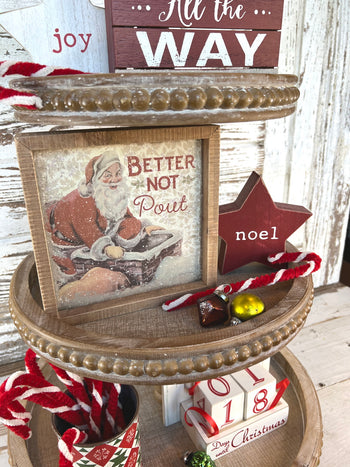 A timeless holiday staple piece, this inset box sign features a vintage-inspired Santa Claus and chimney design, "Better Not Pout" sentiment, and natural wood trim. Complements well with coordinating styles for a cohesive Christmas collection. Easy to hang or can free-stand alone.