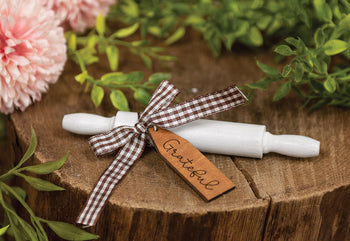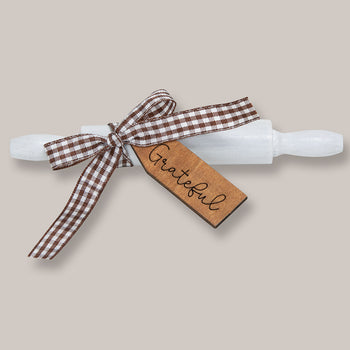This wooden decorative mini rolling pin features a brown gingham bow and a wooden tag engraved with the word, "Grateful." This piece is perfect for a kitchen tiered tray or as an accent in a tabletop arrangement. Has a white, painted surface and measures 5" long by 0.5" in diameter.