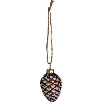 A glass pinecone ornament featuring glitter details for a snowy appearance. Includes a string loop for easy hanging. Made of glass, metal, and glitter.