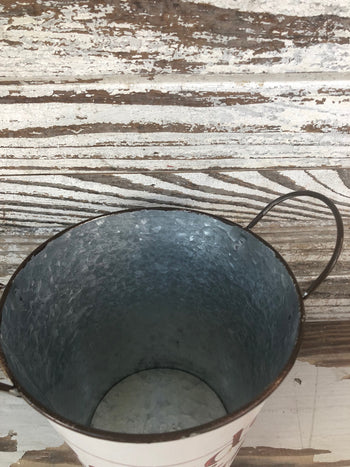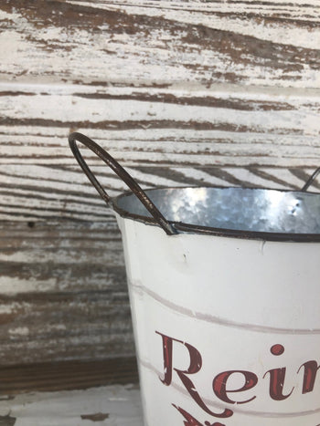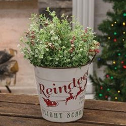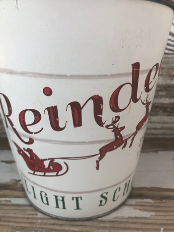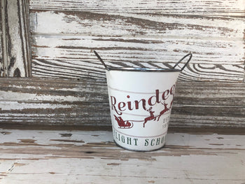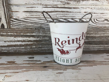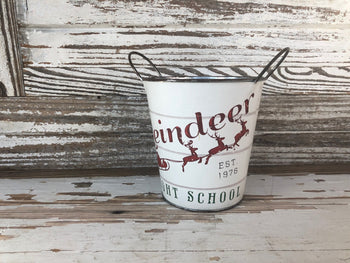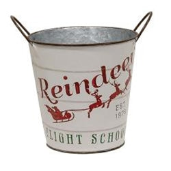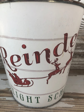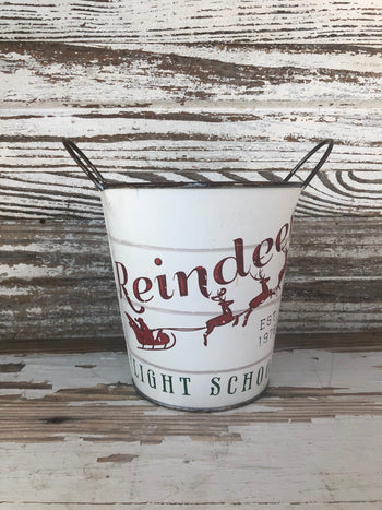 Reindeer Flight School Bucket is a metal container that depicts an ad for Reindeer Flight School with the graphic of Santa flying his sleigh. It reads, "Reindeer Flight School EST. 1976" in red and green lettering and it is further accented by two handles.