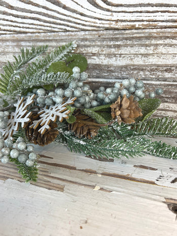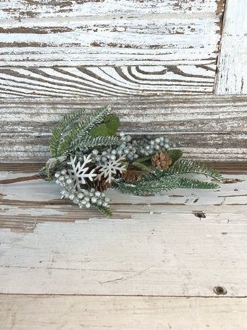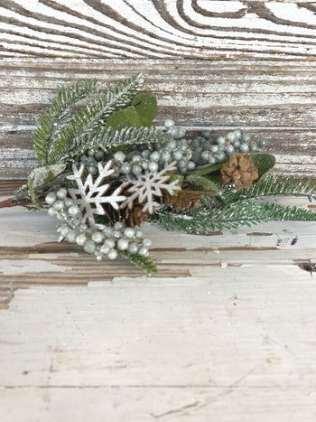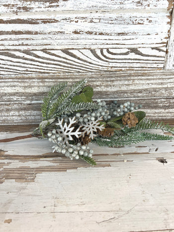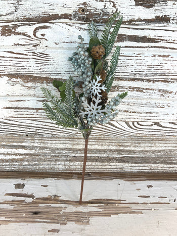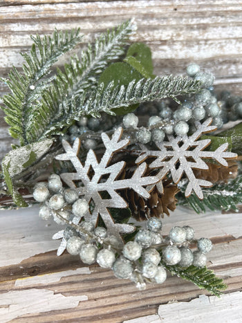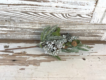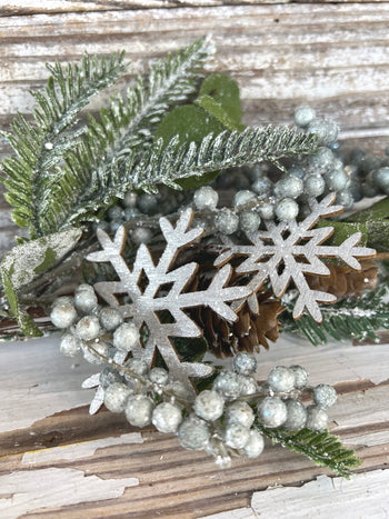 Our Snowflake Greenery Pick is just what you need to decorate an empty table or shelf in your home. Designed with accents shaped like a snowflake and sporting silver and blue gray shades, this faux spray will lace your home with wintry charm. You can also make it a part of an existing faux flower arrangement.