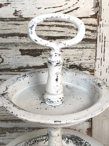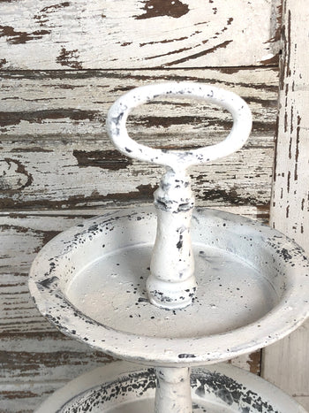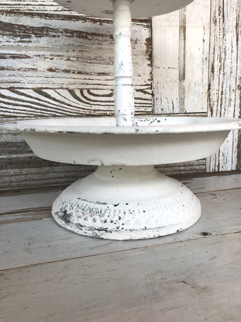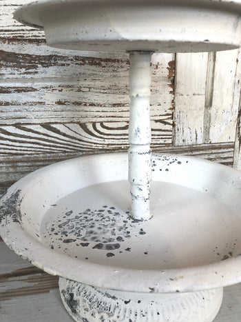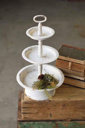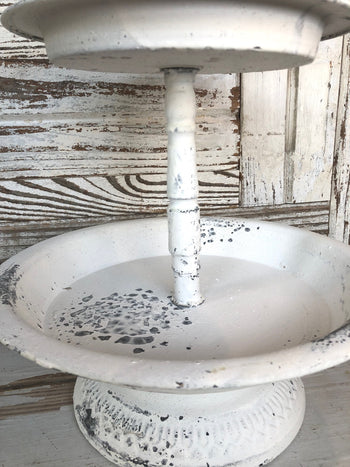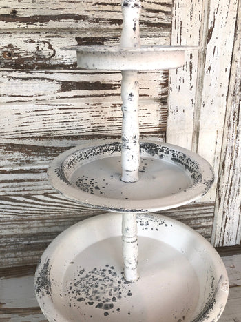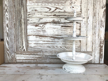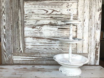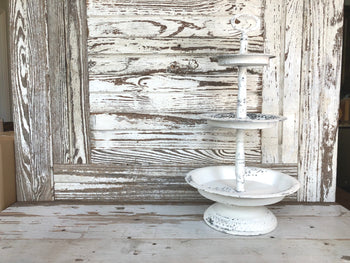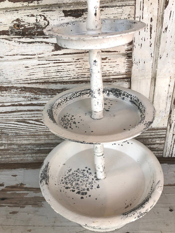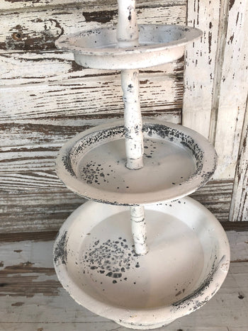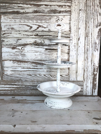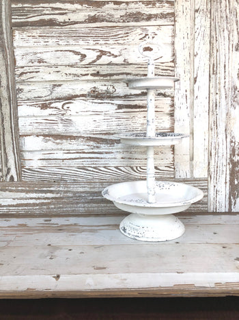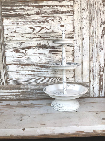 This is a rustic white 3-tiered stand. This display piece is a wonderful base to present the décor of your choosing! The distressed white accents make it great addition to any existing farmhouse, cottage or shabby chic styled home.