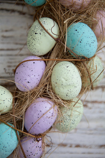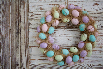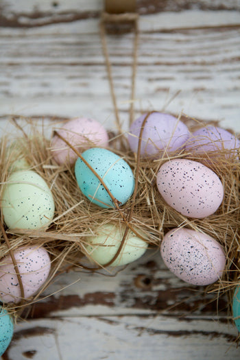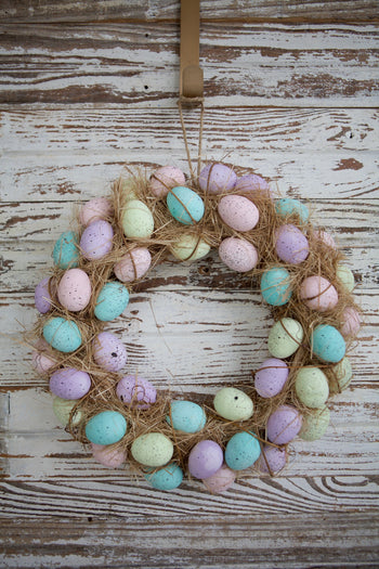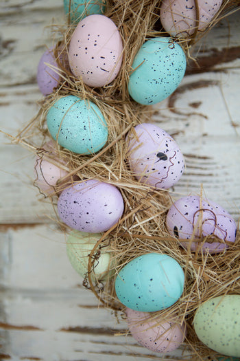 Add this decorative speckled egg wreath to your spring décor. It features a mixed selection of pastel tones that make it a classic decoration. Hang it on an accent wall, above a wall shelf or a front door to be a welcoming addition.