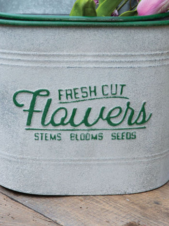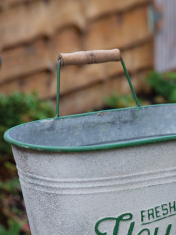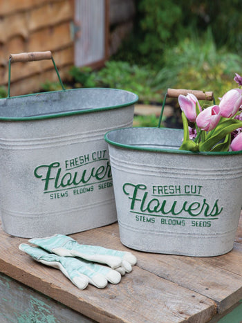 Display this set of two distressed bins with our real feel artificial flowers. These have a distressed finish and are rimmed with a green top. Each have a wooden and metal handle on the back side of the bin. These bins nest together for easy storage. These are not guaranteed water tight.