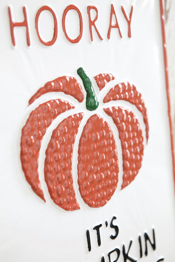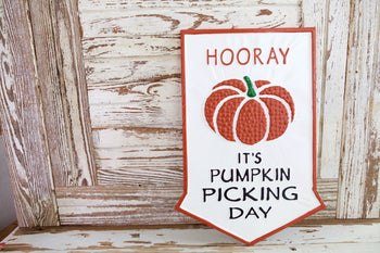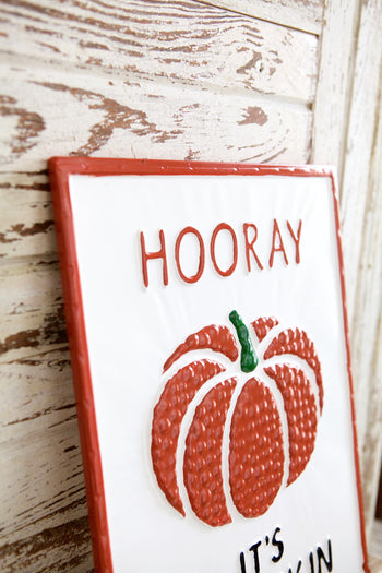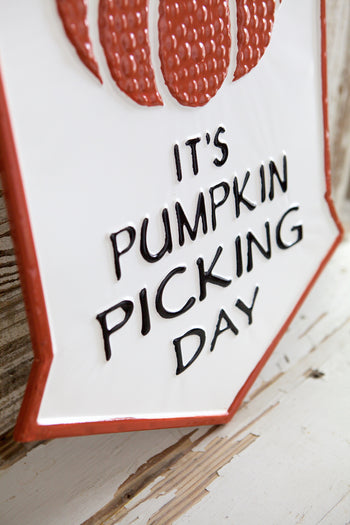 Everyone's favorite day--Pumpkin Picking Day! This metal sign will make a great addition to your farmhouse fall decor. White metal sign trimmed out in orange, with a bright orange pumpkin on it. Hang this wherever you want to add some color.