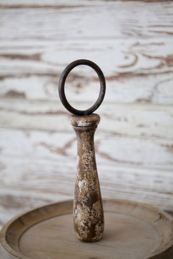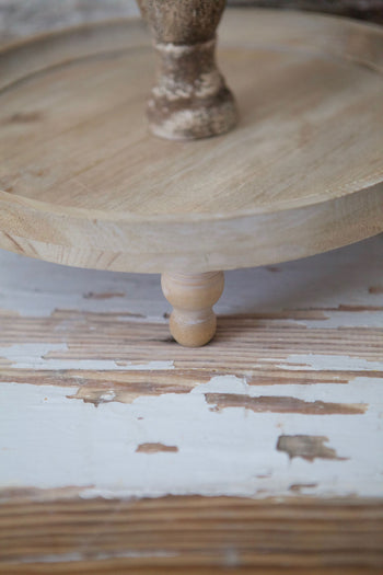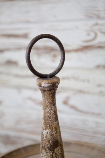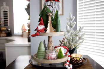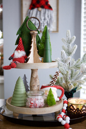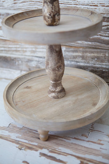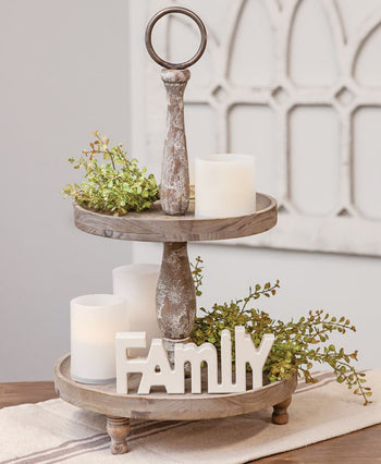 This wooden two-tiered tray is a freestanding tabletop accessory with three wooden legs, two wooden trays, two distressed wooden beams for support, and a metal circular loop on top. It measures 21” high and 12” in diameter and is perfect for decorating with our tray bundles, framed signs, candles, florals, or sitters. The trays can also be used as a functional accent to store knick-knacks, keys, and mail.