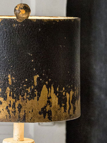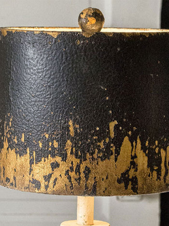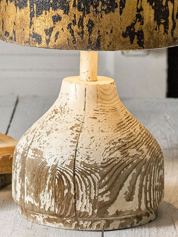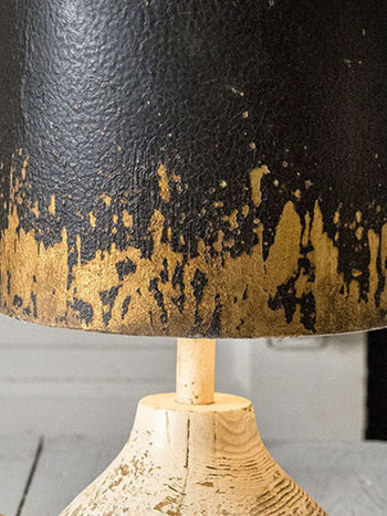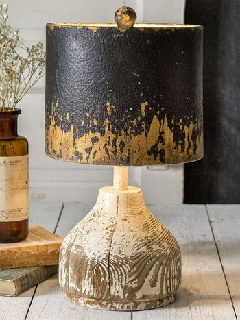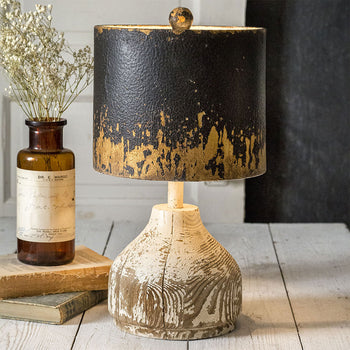 A distressed wood based table lamp gives rise to this eye-catching rustic black and gold metal shade. This out-of-the-ordinary table lamp easily transitions with most décor styles and can be comfortably placed in any room. The shade is made of metal and the lamp base is made of wood. The lamp features and on/off rocker switch on the cord. It requires a standard light bulb, not included. A 8½" x 8½" x 7" shade and harp are included.